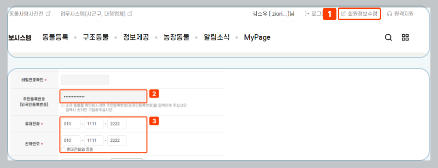 4. 회원정보 수정화면에서 동물등록 정보를 확인합니다